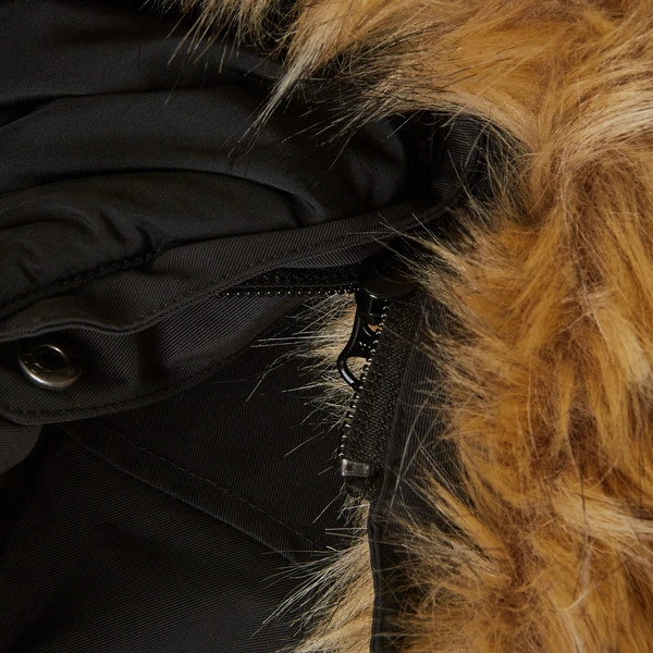 - Kapuze mit Volumenregulierung hinten (mit Klettverschluss) und abtrennbarem Kunstpelz-Besatz